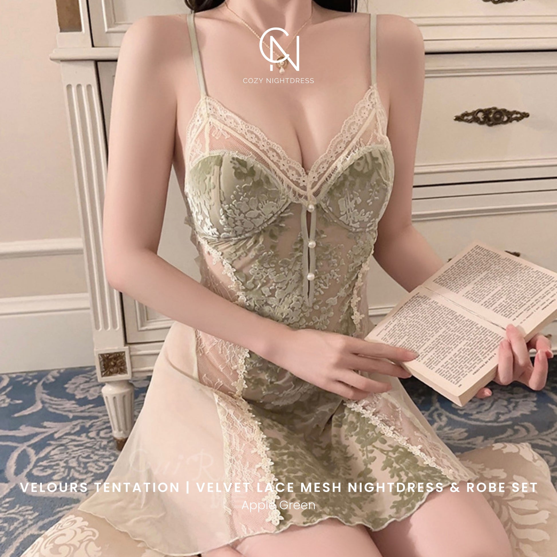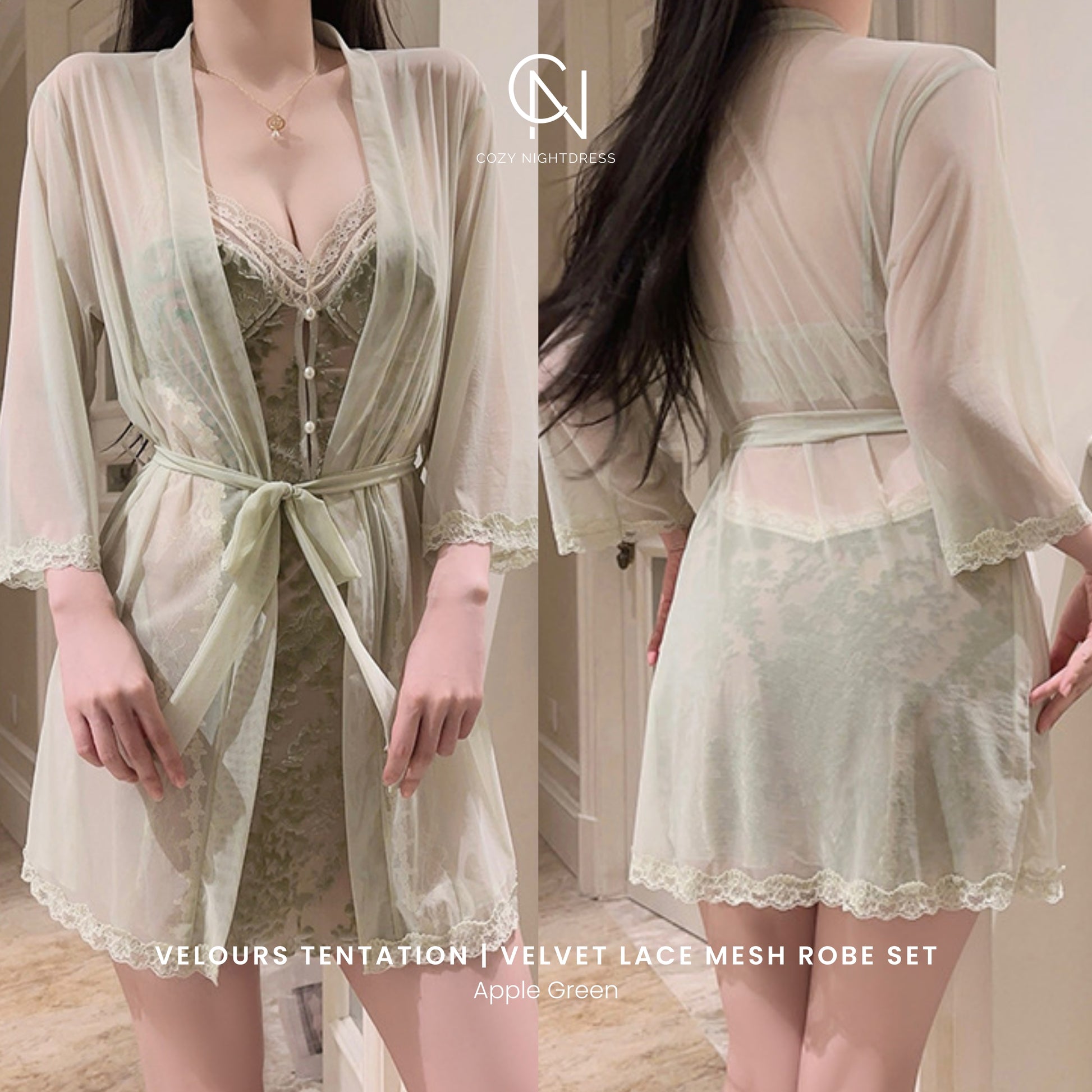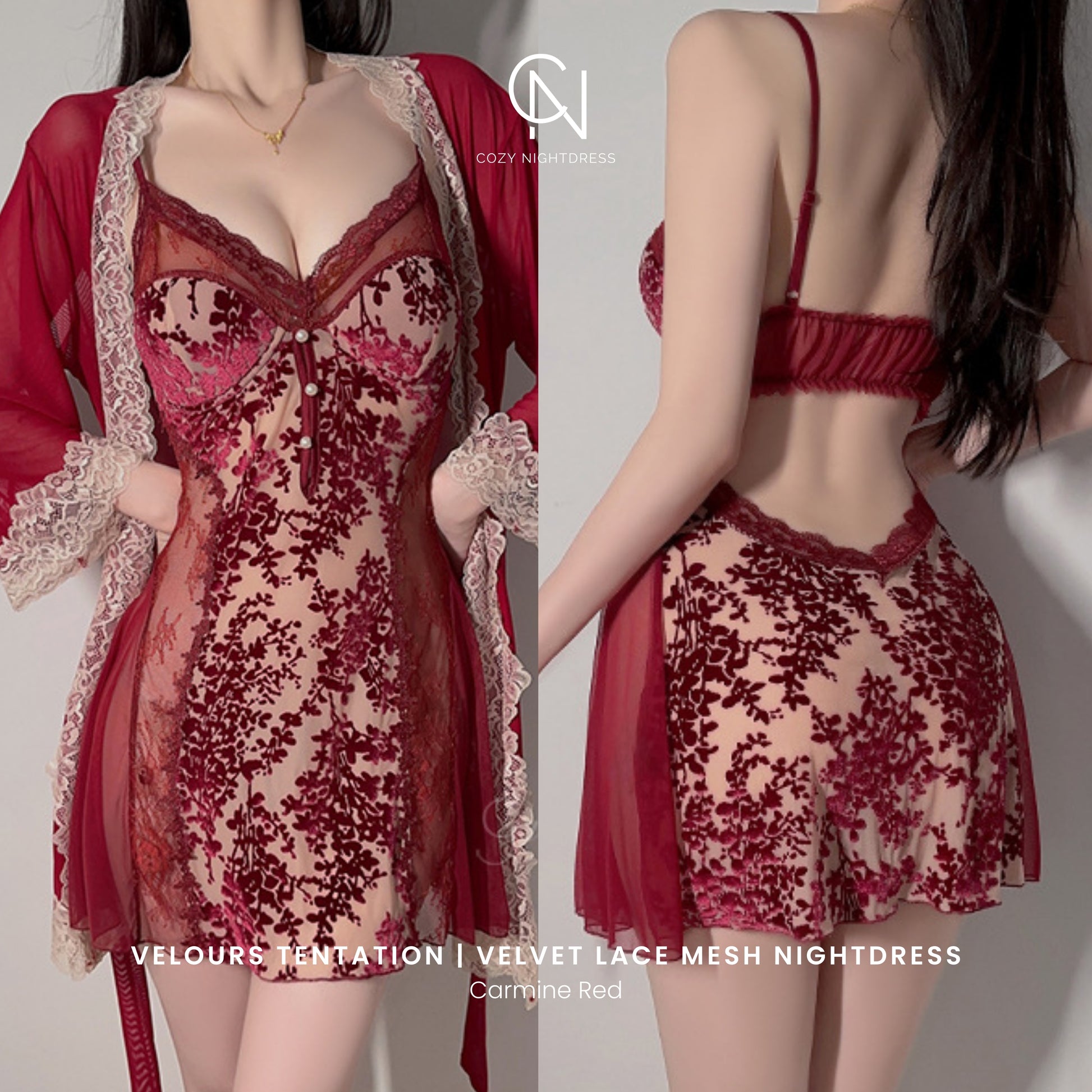 The Velours Tentation Set combines rich velvet texture with sheer lace mesh panels, creating a look that feels both elegant and captivating. Designed with graceful curves, soft transparency, and a flowing silhouette, this set brings together comfort and refined sensuality.